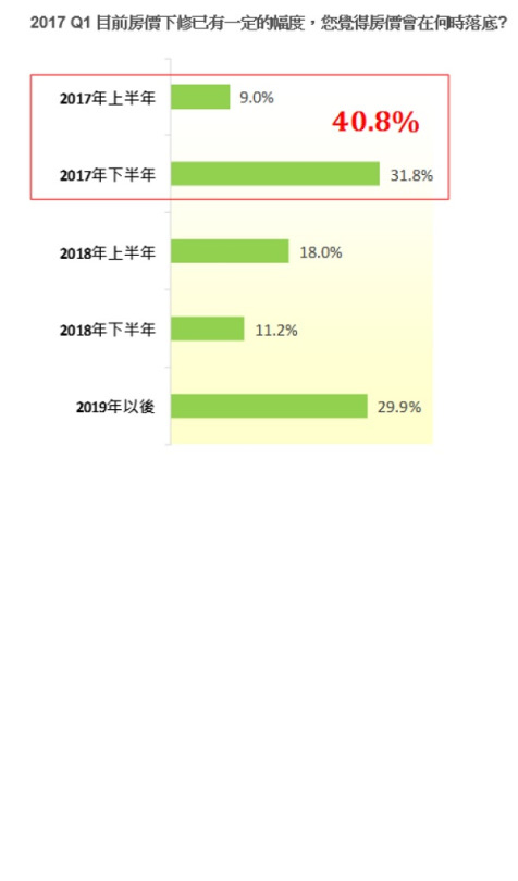 中信房屋指出,新政府上任即將滿一年,沉寂一段時間的房市開始活絡,有超過四成的民眾認為房價落底的時間點會落在2017年,有止跌趨穩的態勢,整體呈現「房市漸漸光」。