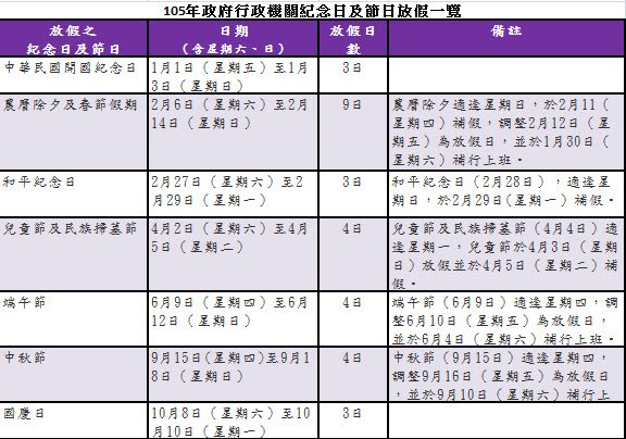 人事總處指出,往年對於放假之紀念日及節日遇到星期二、四,只有農曆除夕及春節假期、兒童節及民族掃墓節連假、端午節及中秋節有調整放假的規範,於103年10月21日「政府機關調整上班日期處理要點」第4點修正後,放假之紀念日及節日只要遇到星期二、四將一律調整放假,並依第5點規定於前一週之星期六補行上班,其係於不影響全年放假日數之下,調整上班及放假日期,將有利於民眾假期休閒活動之規劃。人事總處並指出明年政府行政機關辦公日曆表3日以上之連續假期(併同例假日),計有中華民國開國紀念日(3日)、農曆除夕及春節假期(9日)、和平紀念日(3日)、兒童節及民族掃墓節(4日)、端午節(4日